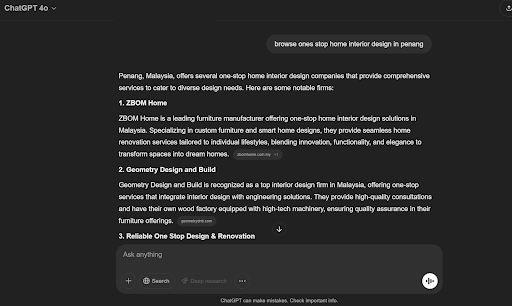 Result of how we help our one stop home interior design company client to get on AI search ranking in 2025